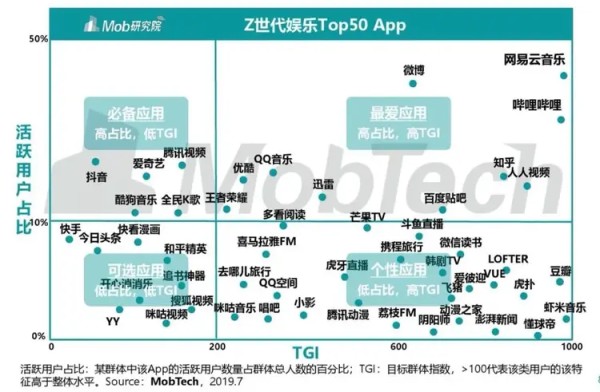 从图中可以看到, B站跟网易云音乐位置最为接近,TGI指数接近1000,是最受Z世代欢迎的两大应用。