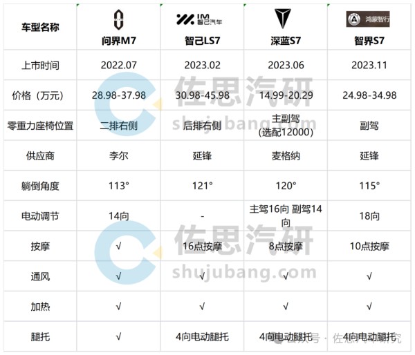 就整椅看,零重力座椅装配迎来小高潮。自2022年7月在问界M7(28.98-37.98万元)上搭载后,智己LS7(30.98-45.98万元)、智界S7(24.98-34.98万元)、极氪X(18.98-20.98万元)、魏牌蓝山(配置|询价)DHT(27.38-30.88万元)、腾势D9(33.5-44.5万元)、传祺新能源E8(20.98-22.98万元)等车型均有配备。其中,2023年6月推出的深蓝S7(14.99-20.29万元),可选配主副驾零重力座椅。