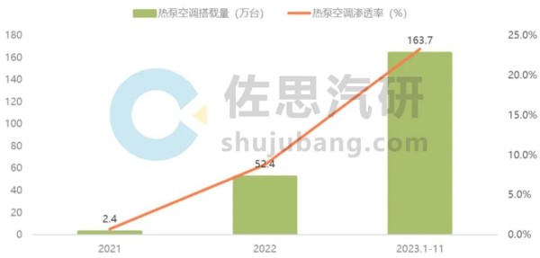 根据佐思汽研数据可以看出,中国的电动车主要从2021年开始搭载热泵空调,并且渗透率提升快速,2023年1-11月渗透率已经达到了23.3%。