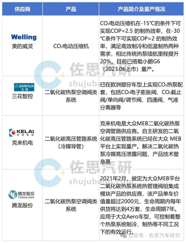 热泵空调冷媒主要包括R-134a、R-1234yf以及R744(二氧化碳)。因R744制冷剂具有更好的环保性、安全性、流动换热性和低温制热效果,可延长车辆续航里程,且原料价格低廉等优势。未来采用R744制冷剂CO₂热泵系统将成为主流。国内厂商已经开始布局CO₂热泵市场: