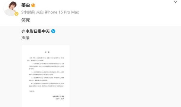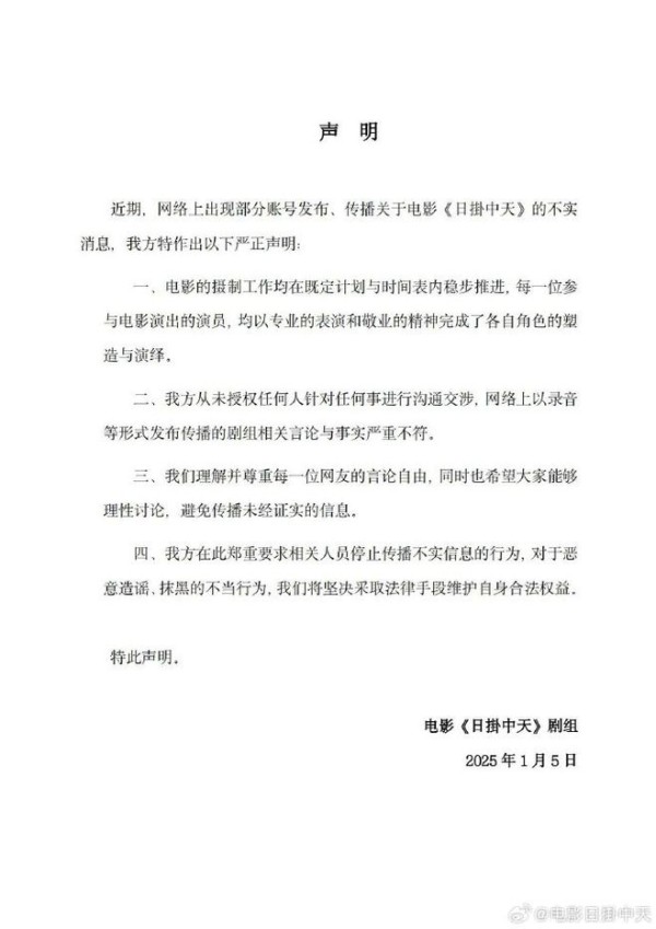 紧接着电影《日掛中天》发布声明,在声明中指出,从未授权任何人针对任何事进行沟通交涉,而网络上以录音等形式发布传播的剧组相关言论与事实严重不符。