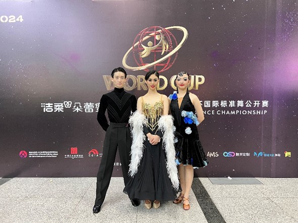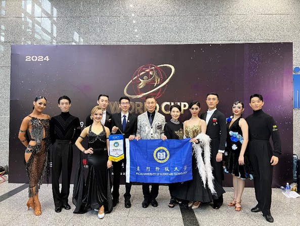 名校明星聯隊隊際賽作為「世界盃」的一項亮點,自首次亮相以來便以其獨特的魅力贏得了廣泛的關注與讚譽。參賽者來自中國內地與港澳台地區的七所高校,包括清華大學、北京大學、復旦大學、深圳大學、香港中文大學(深圳)、台北市立大學的同學們,與職業甲A組的明星舞者搭檔共舞。澳門科技大學作為中國澳門地區唯一獲邀的高校,澳科大藝術團國標舞蹈隊的劉沛錚、肖瑤、張靜怡同學代表澳門舞動賽場,並與深圳大學並列獲得本次比賽季軍。