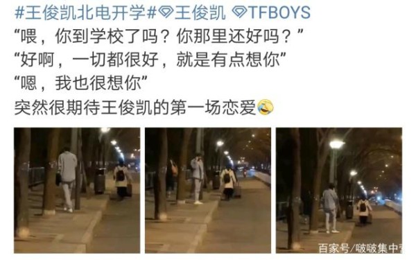 后来还被拍到王俊凯在路边打电话。王俊凯回北京电影学院报道,在路上打电话,粉丝猜测他的电话内容。在马路边,王俊凯被拍到在那里打电话,看到镜头后,貌似就转了个方向。可能也是想避开镜头吧,不想被拍。