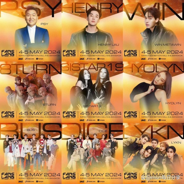 演出将持续两日,从 5月4日首日开始,“Psy”作为主领艺人带您玩转音乐。,多才多艺的艺人阵容如HENRY LAU,还有泰国艺人“WIN METAWIN (Win METAWIN)、韩国Diva级女艺人“SISTAR19, HYOLYN”BUS because of you i shine、DICE,8TURN和LKYN,全部都准备好和您一起进入这次无可比拟的音乐旅行。