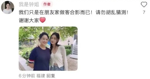有网友发现“我是钟姐”在该贴下方回复网友评论:“我们只是在朋友家做客合影而已!请勿胡乱猜测!谢谢大家。”