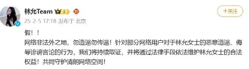 林允工作室也发文辟谣:“假!!网络非法外之地,勿造谣勿传谣!针对部分网络用户对于林允女士的恶意造谣、侮辱诽谤言论的行为,我们将持续取证,并将通过法律手段依法维护林允女士的合法权益!共同守护清朗网络空间!”