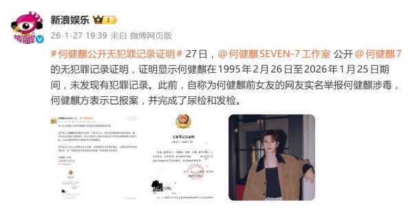 一纸“无犯罪记录证明”,让演员何健麒与前女友的涉毒举报风波,再度冲上热搜。1月27日,何健麒工作室直接晒出由公安机关出具的证明文件,强势回应连日来的舆论风暴,上演了一出娱乐圈自证清白的“标准操作”。