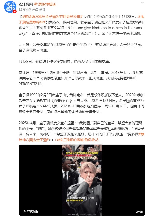 金子涵拉黑蔡徐坤引争议!蔡徐坤工作室回应:仅为节目录制交集