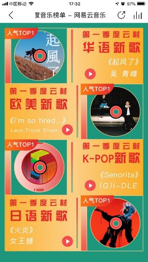此外,这份榜单还盘点了不少高质量海外音乐作品,如云村欧美新歌和专辑人气TOP1分属Lauv 、Troye Sivan合作单曲《i'm so tired...》,“A妹”Ariana Grande的专辑《thank u, next》,云村韩语新歌和专辑人气TOP1由(G)I-DLE《Senorita》和Epik High《sleepless in __________》揽下,女王蜂《火炎》和ONE OK ROCK《Eye Of The Storm》分别摘得云村日语新歌和专辑人气TOP1。