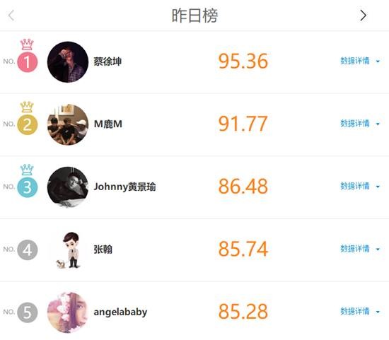 明星势力榜内地榜第23期,蔡徐坤,黄景瑜,鹿晗排名前三