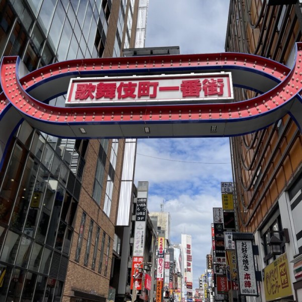 有名な歌舞伎町一番街の看板。新宿東口よりこの看板を抜けていけばすぐに辿り着く。