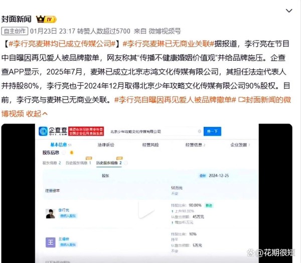 有细心的网友扒出,李行亮和麦琳名下的多家公司已经没有了商业关联。在娱乐圈,夫妻之间解除财产捆绑,通常被看作是关系走向终结的一个明确信号。于是,“婚变”的猜测甚嚣尘上。虽然在他的社交账号里,偶尔还能看到一些和妻子的互动日常,但关注度和点赞量都少得可怜,与麦琳那边动辄上万的点赞形成了鲜明的对比。