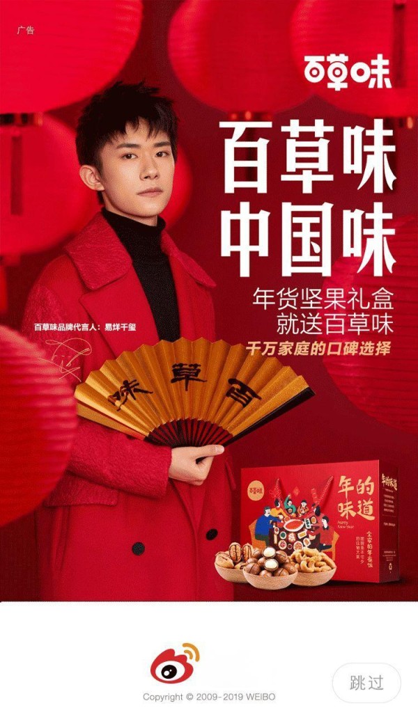 1月19日20:00,百草味微博官宣:易烊千玺成为全新品牌代言人。