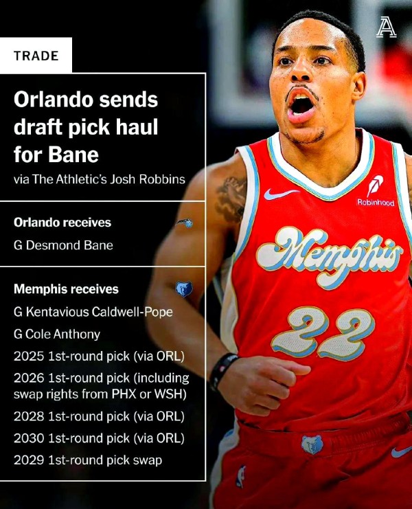 孟菲斯灰熊队将德斯蒙德·贝恩送至奥兰多魔术,以换取肯塔维厄斯·卡德威尔-波普、科尔·安东尼,并获得四个无保护的一轮选秀权和一个一轮选秀权互换权。