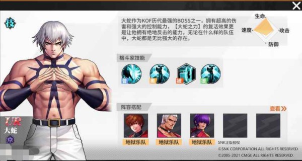由于大蛇本身很契合火属性输出的队伍,所以我们如果没有【炎之宿命克里斯】,也可以替换为【八神庵】【草薙京】等,都是可以提升队伍的整体伤害。打法就是开局叠加大蛇之力,后期输出打爆发即可。