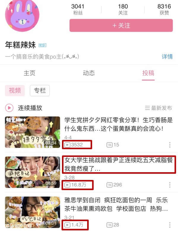 B站上一位UP主@年糕辣妹 更是现身说法,用瘦七斤来证实尹正减肥餐的有效性,这条标题为《女大学生挑战跟着尹正连续吃五天减脂餐 我竟然瘦了...》的视频,播放量也达到了16.8万,是她日常视频的10余倍,这样的数据,也从侧面证实了尹正的减肥VLOG在B站的影响力。
