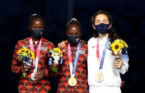 8月8日,肯尼亚选手切普奇奇(中)、亚军肯尼亚选手科斯盖(左)与美国选手塞德尔在闭幕式举行的颁奖仪式上,她们分获东京奥运会女子马拉松的冠亚季军