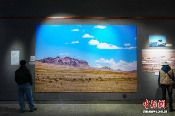 图为大幅藏羚羊照片吸引观众。中新社记者 刘冉阳 摄