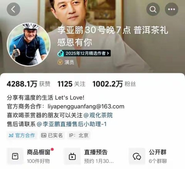 李亚鹏直播卖茶狂揽 1.6 亿登顶榜首!不喊麦不逼单反劝理性消费