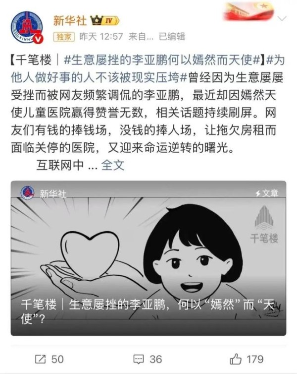 这个决定一出,瞬间让网友们想到了此前引发热议的嫣然儿童医院。不久前,有消息称嫣然儿童医院因为拖欠房租,面临关停的困境。这家医院承载着太多孩子的希望,消息一出,大批网友都通过各种渠道自发捐款,相关话题也持续刷屏,牵动着无数人的心。如今李亚鹏宣布捐出直播收入,无疑是给这家医院,给那些需要帮助的孩子们,送去了一份沉甸甸的希望。这份担当和情怀,瞬间让他的形象高大了不少。