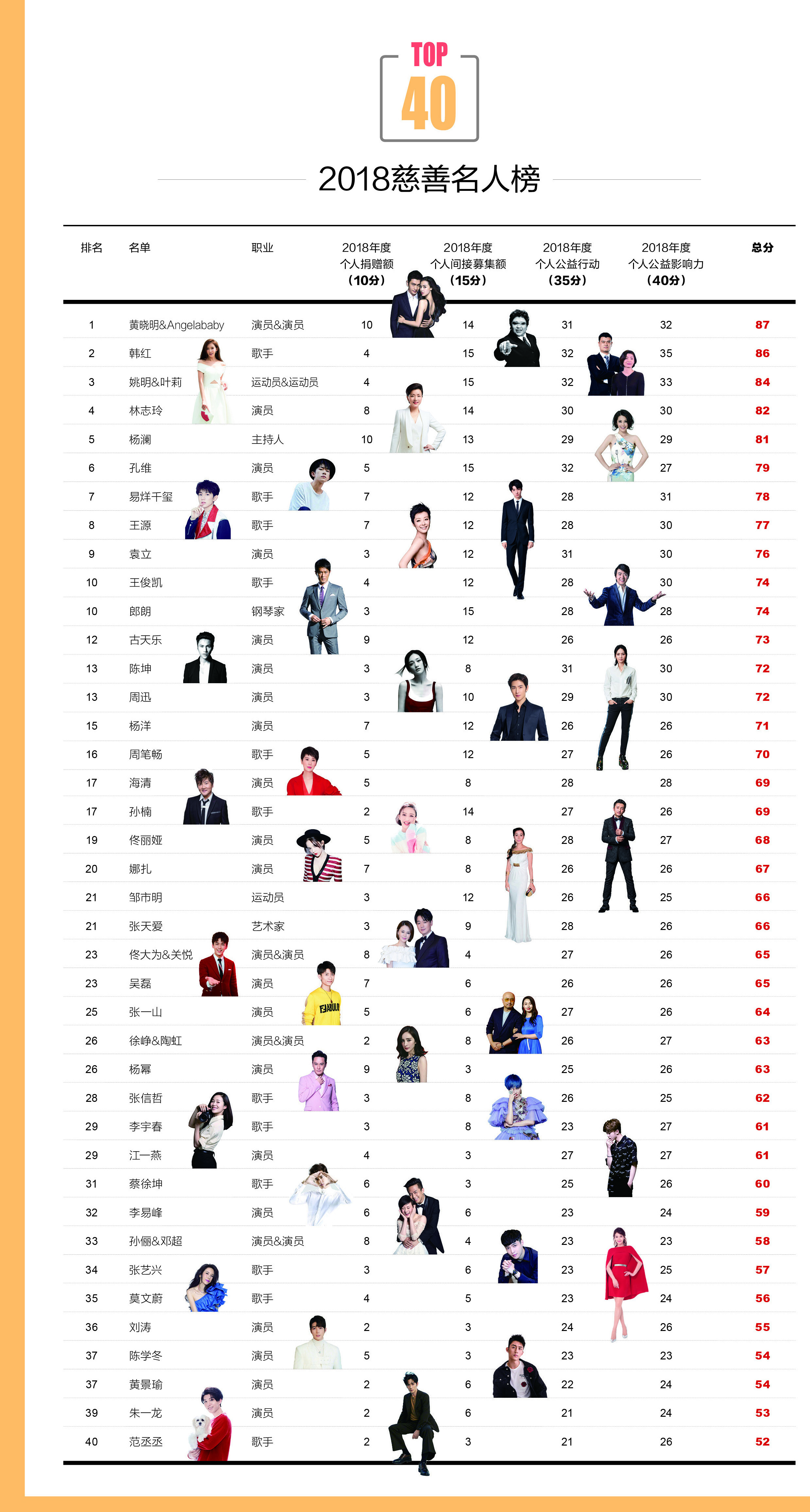 在"2018慈善名人榜"调研过程中,我们发现无论是持续经年践行公益的慈善大咖,还是还是新近参与到这一领域的新星,越来越多的公众人物将其社会影响力用于公益事业。正因如此,本届榜单容量首次由30人扩展到40人,更全面、系统地呈现明星和名人在公益慈善领域的善举。