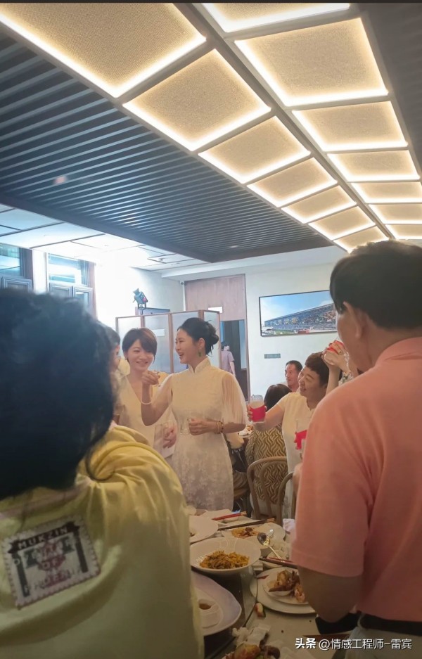 这天董璇穿着敬酒服将头发盘起,戴着硕大的珍珠耳环和成套的珍珠戒指,看着十分的端庄大气。她笑容灿烂正在给宾客敬酒,脸上洋溢着幸福的笑容。身后的张维伊也在招待宾客,大家均是一片喜气洋洋。