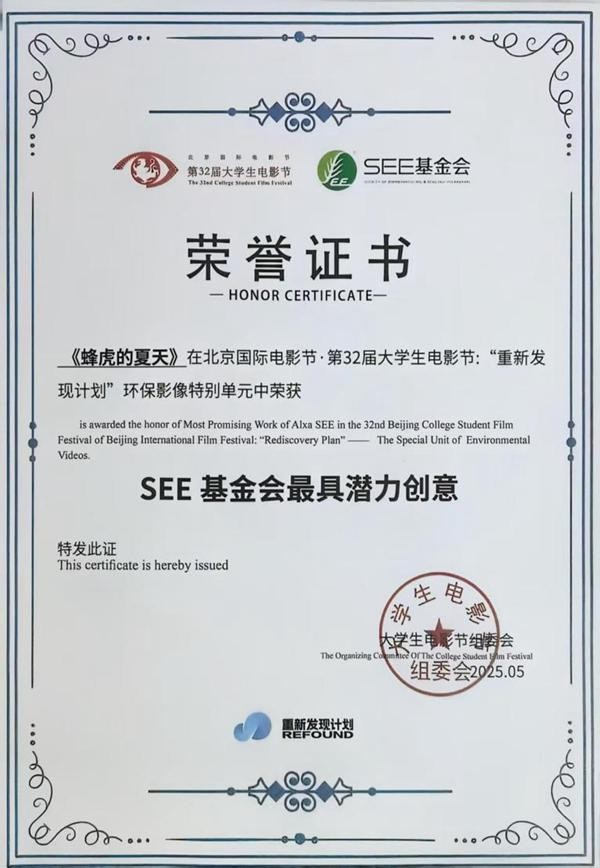 纪录片《蜂虎的夏天》获奖证书。主办方供图