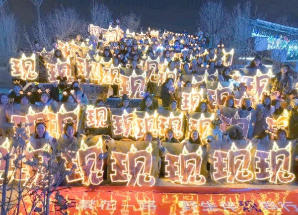 女孩们手挽着手,聚在一起拍照留念,轮流站在灯牌前与心中的偶像合影。