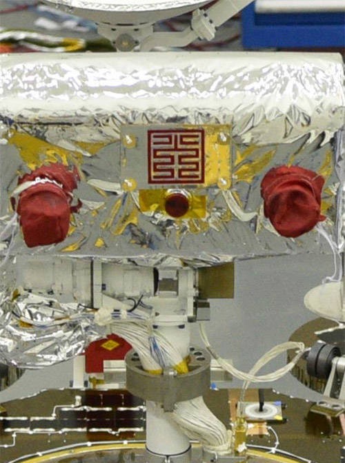 “祝融号”火星车车标安在桅杆顶部,出自宋代篆体官印“桓术火仓之记”,图案主体为九叠篆的“火”,又似“中国”二字的组合,且形如发射塔或火箭发射