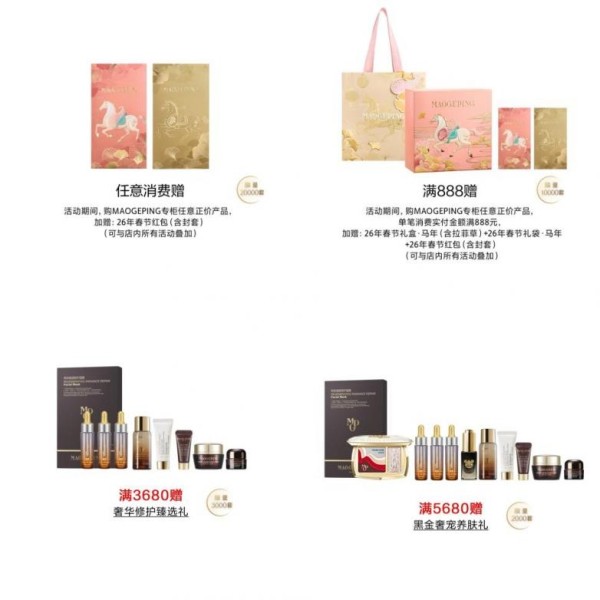 购MAOGEPING专柜任意正价产品,加赠马年春节红包(含封套);满888元,加赠“春节礼盒礼袋+春节红包”(可与店内所有活动叠加)。