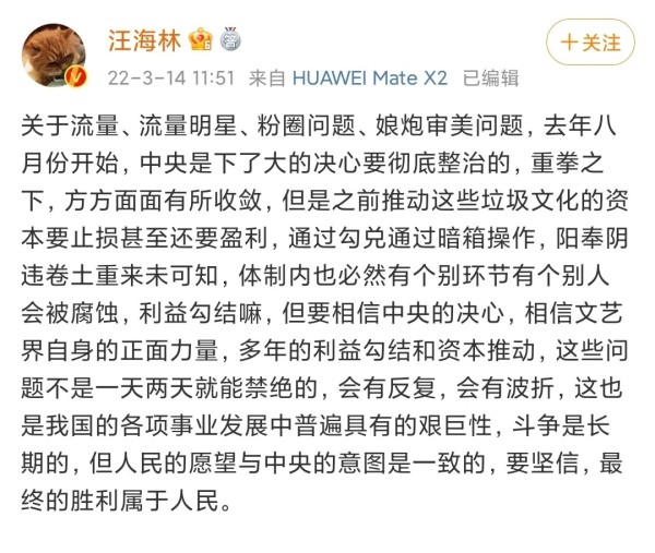 其实大家心里都明白,所有明星都是资本运作的成果,只不过汪海林似乎更喜欢针对肖战,至少其他流量明星出事的时候,汪海林的屁股好像是歪的。比如当初刘浩存和孟美岐,汪海林就是选择站队,可问题是这两人也是资本捧出来的。