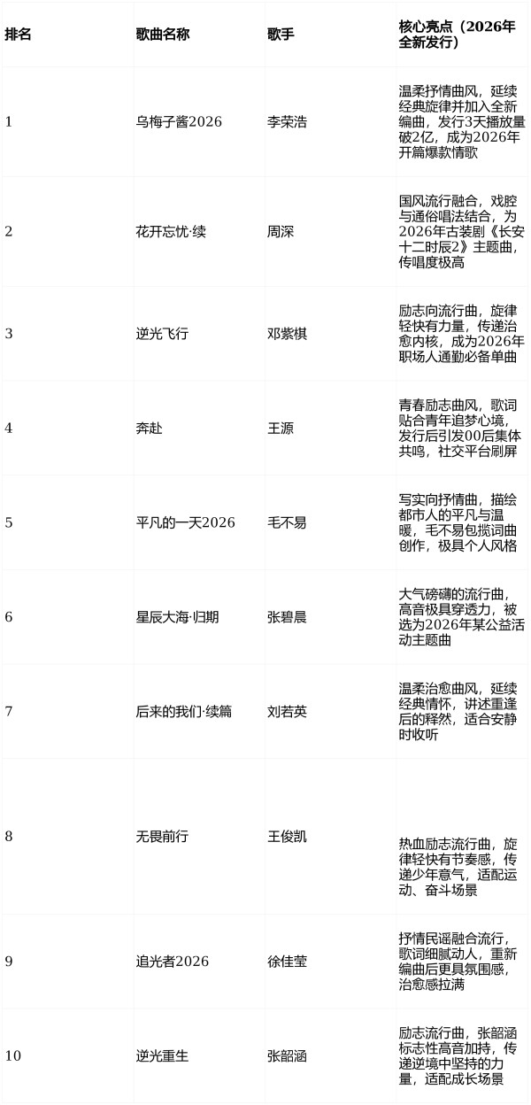 核心说明:结合QQ音乐、网易云音乐热歌榜,筛选2026年全新发行、播放量破亿、讨论度超10万的单曲,兼顾多元曲风。