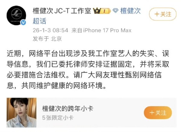 再看檀健次和鹿晗那边,回应简直一模一样,全是官方套话:“感谢关心,专注工作,勿信谣言。”这种话听着耳熟吧?跟之前哪个明星出绯闻时的回应几乎没区别,连标点符号都没改几个。你说这是真没事,还是压根不知道咋回应?反正我看着就觉得虚,要是真问心无愧,为啥不敢多说两句?非得拿这种万金油模板应付人?