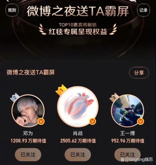 微博之夜期待值前十的明星排名,肖战第一,只有两位女明星上榜