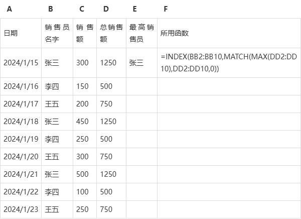 应用: 在本例中,我们使用这两个函数结合来找出销售额最高的销售员。公式=INDEX($B$2:$B$10,MATCH(MAX($D$2:$D$10),$D$2:$D$10,0))首先通过MATCH函数找到D列(即总销售额列)中最大值的位置,然后通过INDEX函数返回对应销售员的名字(位于B列)。这样就可以准确地找出销售额最高的销售员。