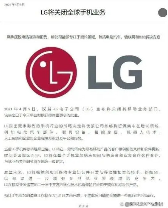 LG电子不得不断臂求生,“抛弃”手机业务。2021年4月5日,LG电子在其董事会上宣布,将在2021年7月31日后全面停止生产和销售手机,主要由于自身移动业务长期处于亏损状态,不敌激烈的竞争所致。