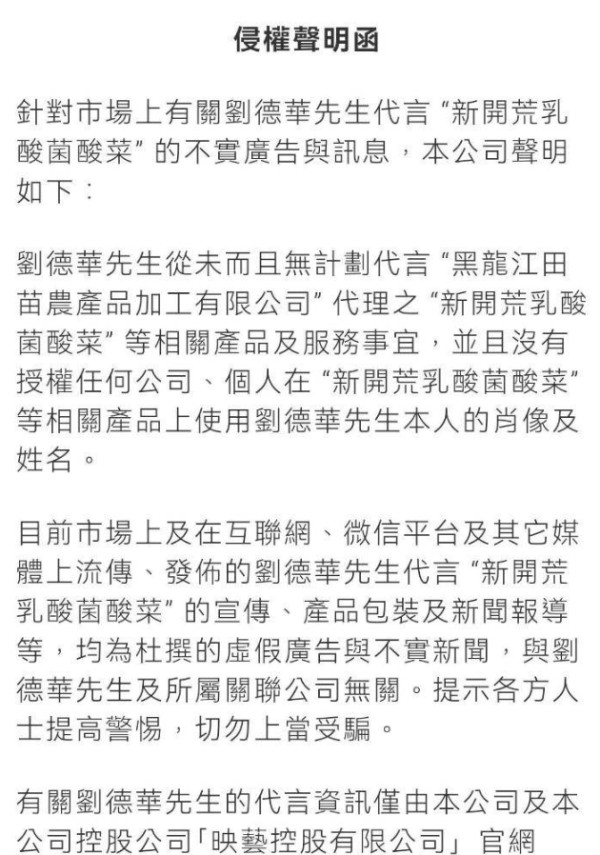 品牌宣传的重要性无需赘述,而良好的品牌宣传得益于强大的传播影响力。某酸菜品牌选择与实力派演员和歌手刘德华合作,无疑是看中他广泛的知名度和美誉度。然而,黑龙江田苗农产品加工有限公司旗下名为"新开荒乳酸菌酸菜"的产品在宣传品中滥用了刘德华的形象,这不仅没有得到华仔方面的同意,甚至已涉嫌违规宣传,构成了对消费者的欺诈和误导。