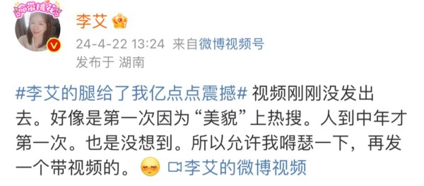 随后李艾还分享了自己走秀的视频,她说:“好像是第一次因为“美貌”上热搜。人到中年才第一次。也是没想到。所以允许我嘚瑟一下,再发一个带视频的。”