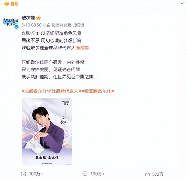 8月10日,敷尔佳与成毅发布了一条共创微博,正式官宣。