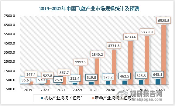 疫情背景下,人们健康意识增强,同时,虽然国内疫情得到有效防控,但长途旅游仍受到一定的条件限制,在城市周边找个场地玩一项容易上手的运动,就成了很多人的选择,飞盘运动因此出圈。加上飞盘有新手友好、年龄友好、性别友好的属性,不强调身体对抗,不同人群可以一起玩。并且飞盘本身安全性高、趣味性强,多数体验过飞盘的人会选择再度尝试,“复购率”非常高,因此在短期内得到爆发性增长。从2021年下半年开始,社交媒体上关于“飞盘”的帖子越来越多,2021年,小红书飞盘内容发布量同比增长6倍,截至2022年上半年,小红书上“飞盘”相关的搜索量同比增长约44倍,已经连续多个月出现爆发性增长。此外,飞盘的销量也从2022年2月起也开始直线飙升。2月份单月极限飞盘交易金额为90万左右,7月单月已突破800万,截至2022年7月,天猫淘宝飞盘销售额超2657万,相比同期翻4倍有余。全拓数据显示,2022年,我国飞盘产业核心市场规模约232.4亿元,带动产业市场规模约1993.5亿元。总体来看,后疫情时代,人们对轻运动、重社交的新城市户外运动的兴趣持续增长,飞盘成为新城市户外运动的新载体,迎来发展新机遇,预计2027年,我国飞盘产业核心市场规模将达645.1亿元,带动产业市场规模将达6523.8亿元。