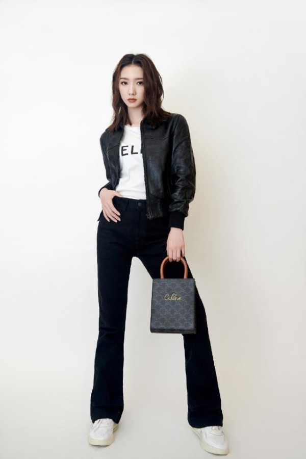 孟美岐身穿皮衣搭配黑色休闲牛仔裤