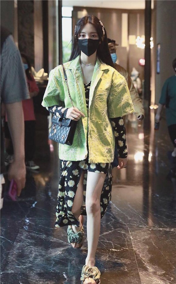 荧绿色在夏天是很清爽的颜色,某次杨超越在机场穿了一件荧绿色西装外套,内搭碎花套装让人眼前一亮。绿色的外套上点缀了花朵的刺绣,看起来更加亮眼时尚,内搭的裙子是小V领的设计能很好地修饰脸型,搭配的锁骨链不会显得脖子太空,裙子下摆是一侧时尚的设计,能很好的露出大长腿,后面的长度还能随着走路飘动,裙子上的小雏菊图案与外套相呼应,整体造型颜色风格搭配的清爽自然。