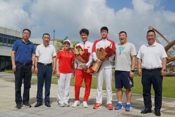 2021年10月,潘展乐和徐嘉余回母校探望拍照留念(温州体育运动学校供图)
