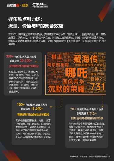 从剧集的预热、上映到口碑发酵,从电影的宣发、争议回应到票房转化,再到短剧从垂直圈层走向大众视野,百度娱乐热搜覆盖文娱内容的多维度、全周期。通过对优质内容的持续曝光和讨论,不仅助力作品获得市场成功,更有效提升演员的行业影响力和商业价值。比如,《哪吒之魔童闹海》上榜热搜超千次,总曝光量超6.6亿次,高频持续曝光成为突破圈层、覆盖全民的重要助力;《藏海传》《沉默的荣耀》等热度与口碑兼具的影视剧,成为百度热搜年度影响力品质剧集。在短剧等新兴领域,热搜成为突破“内容找人”的关键力量,为用户提供“追剧清单”和话题引导,让优质内容获得更多关注。