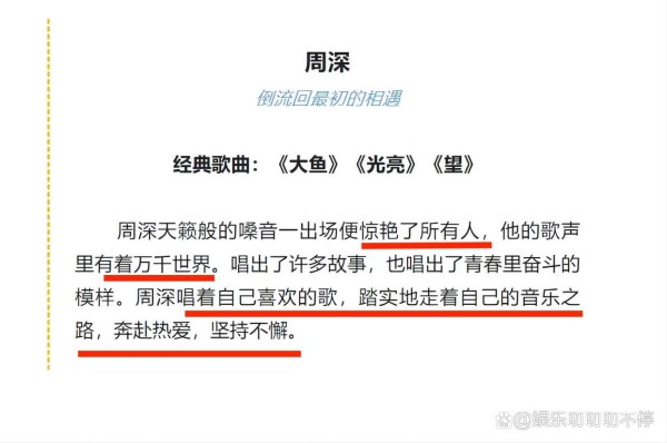 不过,这中间值得注意的是,“央视文艺”对周深参加歌会的官微宣传文案(见下图,为避免文章原创性低,只能截图了)。而“央视文艺”公众号也以《央视全新IP夏日歌会<这young的夏天>周末竖屏开唱,邀你重游青春再狂欢》为标题发文,介绍了这次歌会的相关内容、时间、歌手及演唱歌曲等内容,其中对周深的介绍到是,“倒流回最初的相遇”,经典歌曲为《大鱼》、《光亮》、《望》,所配文案“惊艳了所有人、歌声里有着万千世界”。