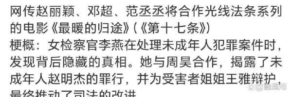 说到电影圈的联动,最近一个令人期待的大瓜浮出水面,赵丽颖、邓超和范丞丞三人似乎要合作出演法条系列电影。这一消息可谓炸翻了影迷圈“这是什么神仙组合?姐妹情结、影帝风采外加偶像的超新星,每个都自带流量和话题热度,简直就是下一个爆款预订!”