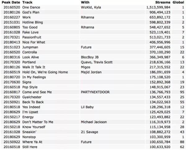 截至7月21日,Drake已有29首作品在Spotify上播放量破亿