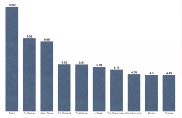 目前,仅针对发布在平台上的作品版权而言,Spotify的单曲播放一次平均支付价格为0.00437美元。而没有免费用户群体的Apple Music价格则更是达到了0.00735美元。即使以单次播放平均收入为0.005美元来计算,Drake在两家流媒体音乐服务上所得也已超过1.15亿美元。