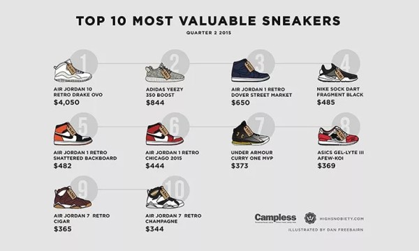 其中,Drake于2011年推出的品牌October’s Very Own(OVO)与Air Jordan、Canada Goose等均展开合作,尤其是和Air Jordan合作的联名球鞋引发追捧热潮。在去年 Highsnobiety网站Q2季度最高价值球鞋榜单中,OVO x Air Jordan X 甚至超越 Yeezy Boost 350牢牢占据第一。