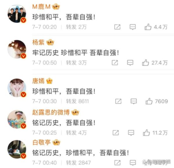 各位网友,今天我们来谈谈那些星光璀璨背后的责任感!7月7日,一个让所有中国人都应铭记的日子,央视以一则深情而有力的消息提醒我们:勿忘国耻,自强不息。此消息一出,立马引发了娱乐圈的广泛响应。从肖战到唐嫣,从谢霆锋到杨紫,无一不在这重要时刻表达了自己的立场。